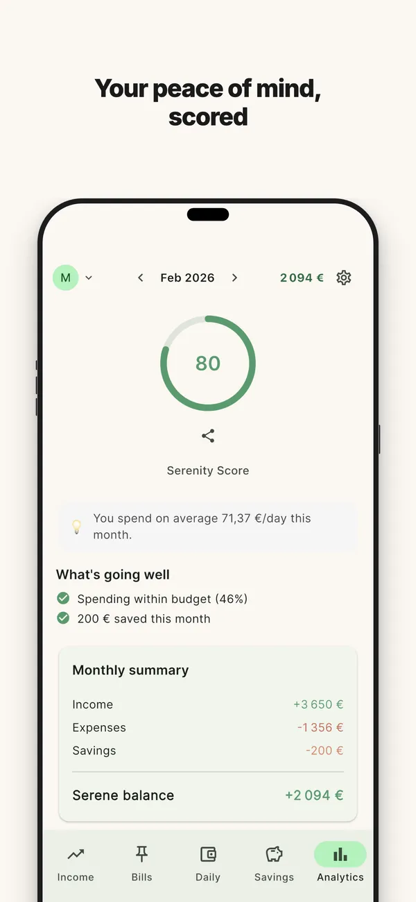 - Couple budgeting — share your budget via QR code without sharing bank access. The Serenity Score becomes a shared household score.