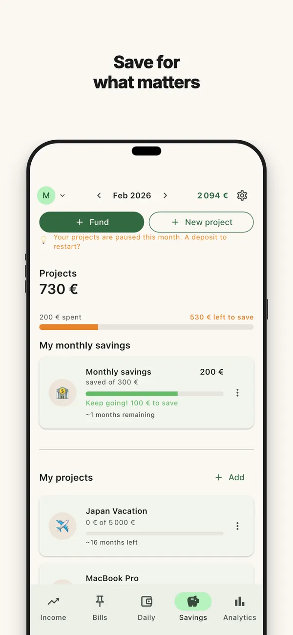 Set a goal, the app calculates the monthly amount. Track your progress month after month.
